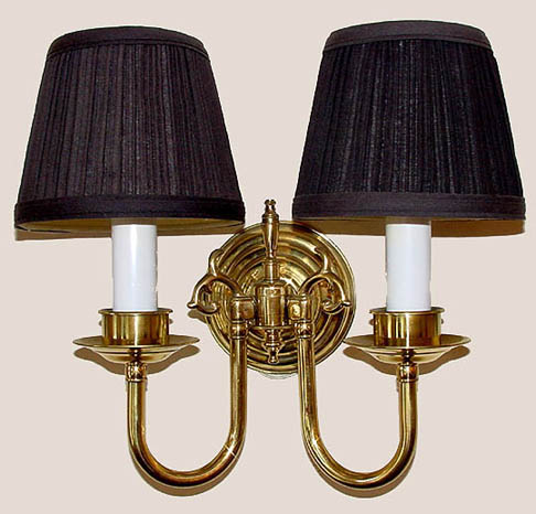 Like our MODEL NS101 but shown in Polished Brass and with other custom options like a different finial and candle cups. Subtle differences can change the feel of a fixture drastically. It can be made in any other metal color. Solid brass construction and a lovely black mushroom pleat fabric shade. Our shades clip on to the bulbs for easy installation and cleaning.