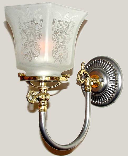 Shown on HGTV this single wall lamp is truly a work of art. Finished in mixed metals, this French Country gas light reproduction is pewter with 'gem' accents in polished brass. A hexagonal etched glass shade completed the Victorian look.